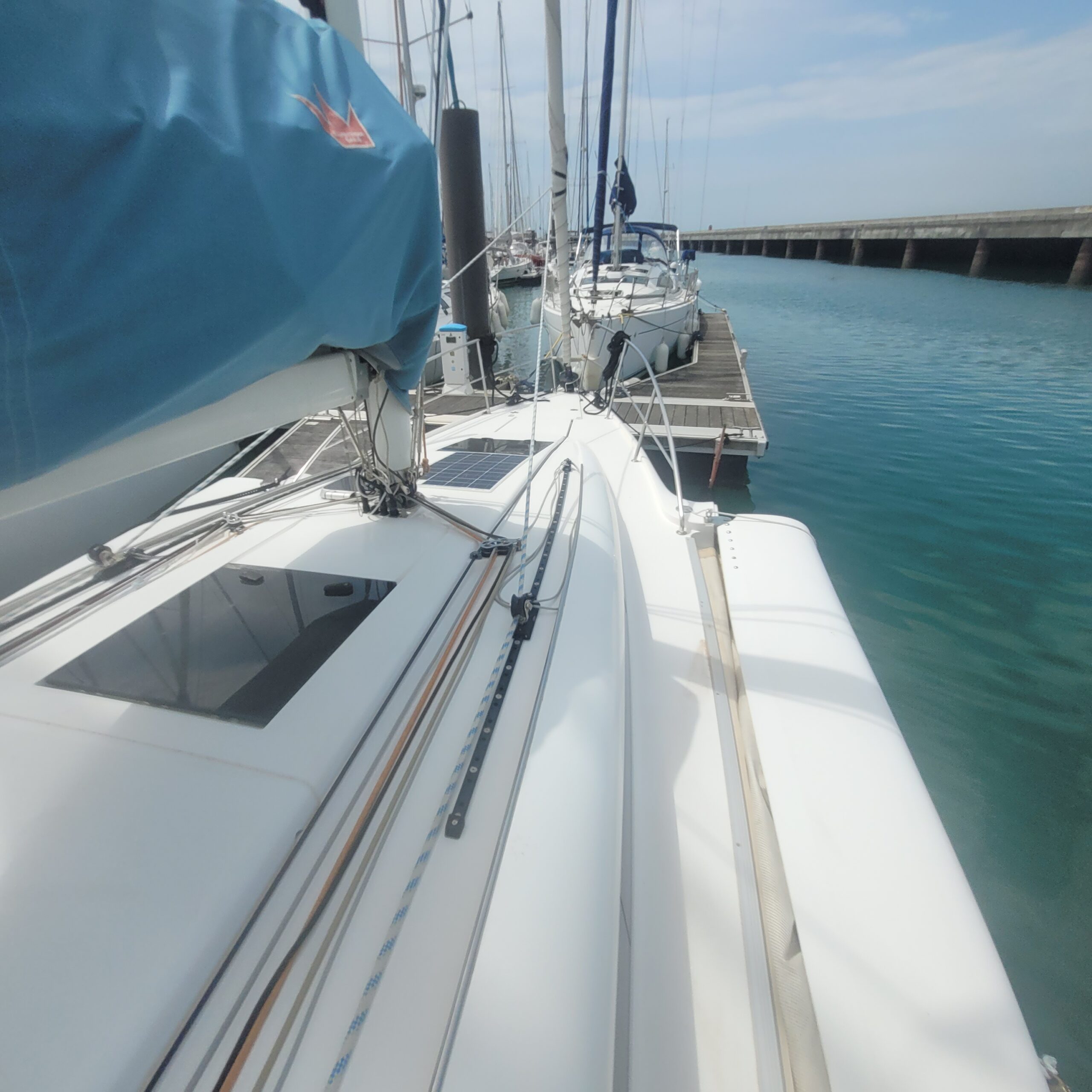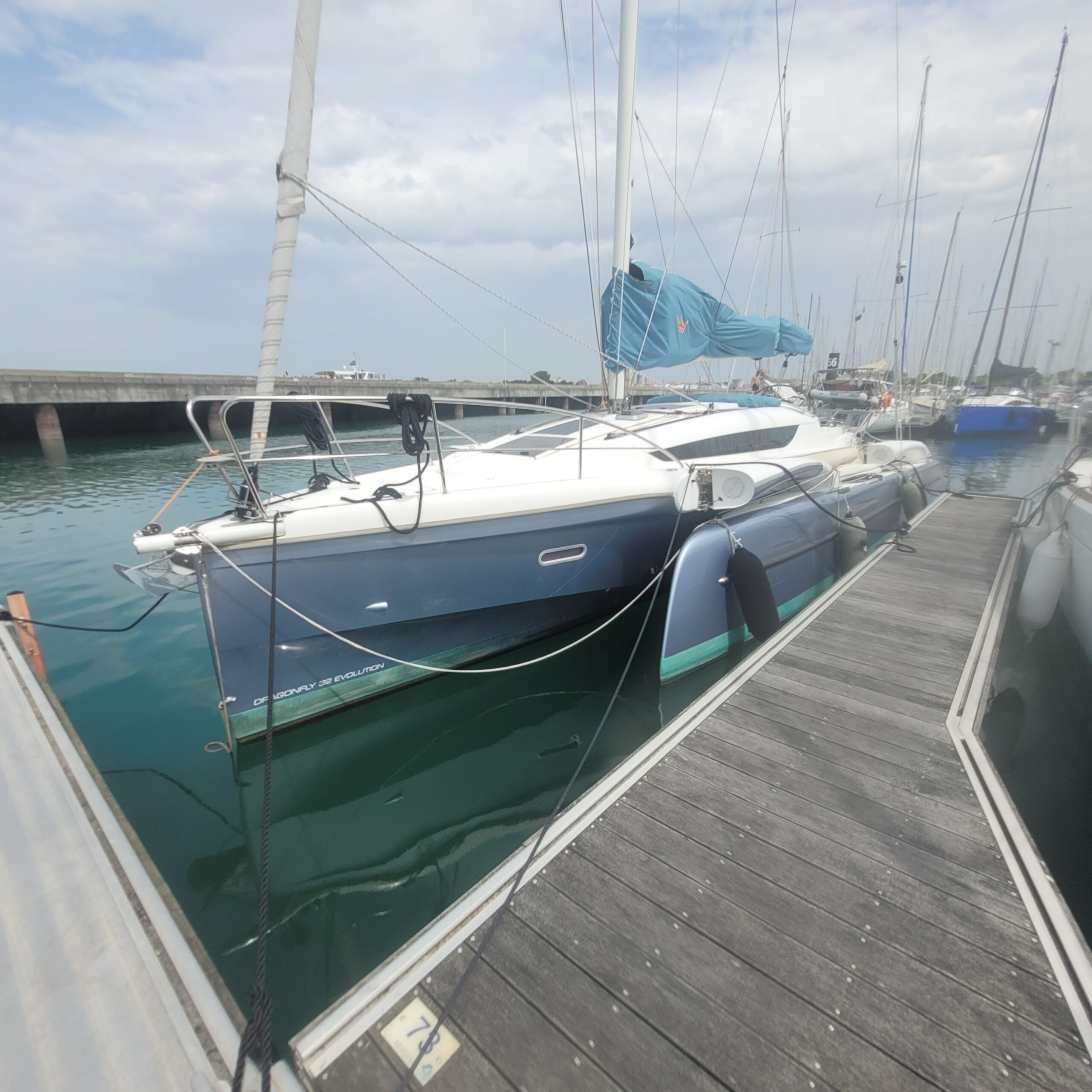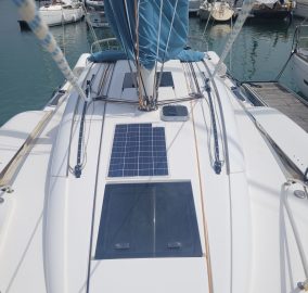 Côté autonomie et entretien, le bateau est équipé de panneaux solaires sur flotteurs et coque centrale ainsi que d’un antifouling Coppercoat.