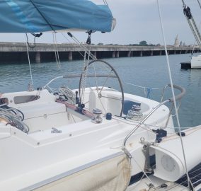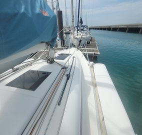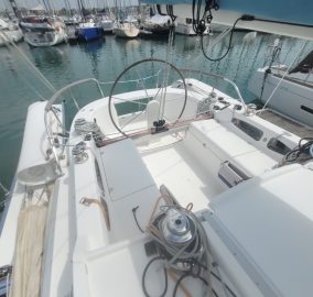 Propulsé par un moteur Yanmar 21 CV, il dispose d’un aménagement élégant en menuiserie orme avec cabine double à l’avant, cabine d’appoint à l’arrière et toilette séparée. L’équipement de confort est complet avec réfrigérateur, chauffe-eau, dessalinisateur, propulseur d’étrave et barre à roue.