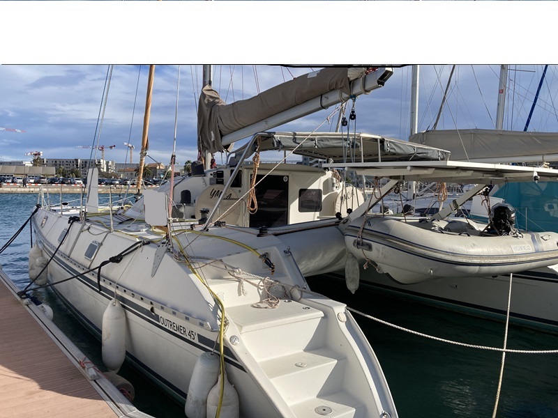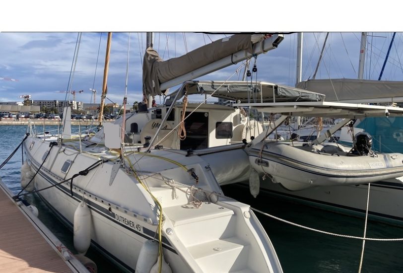 Outremer 45 de 2004 , le vainqueur de l' ARC 2011 / 4 cabines , 2 barres à roues (unique) sur cloison de roof.