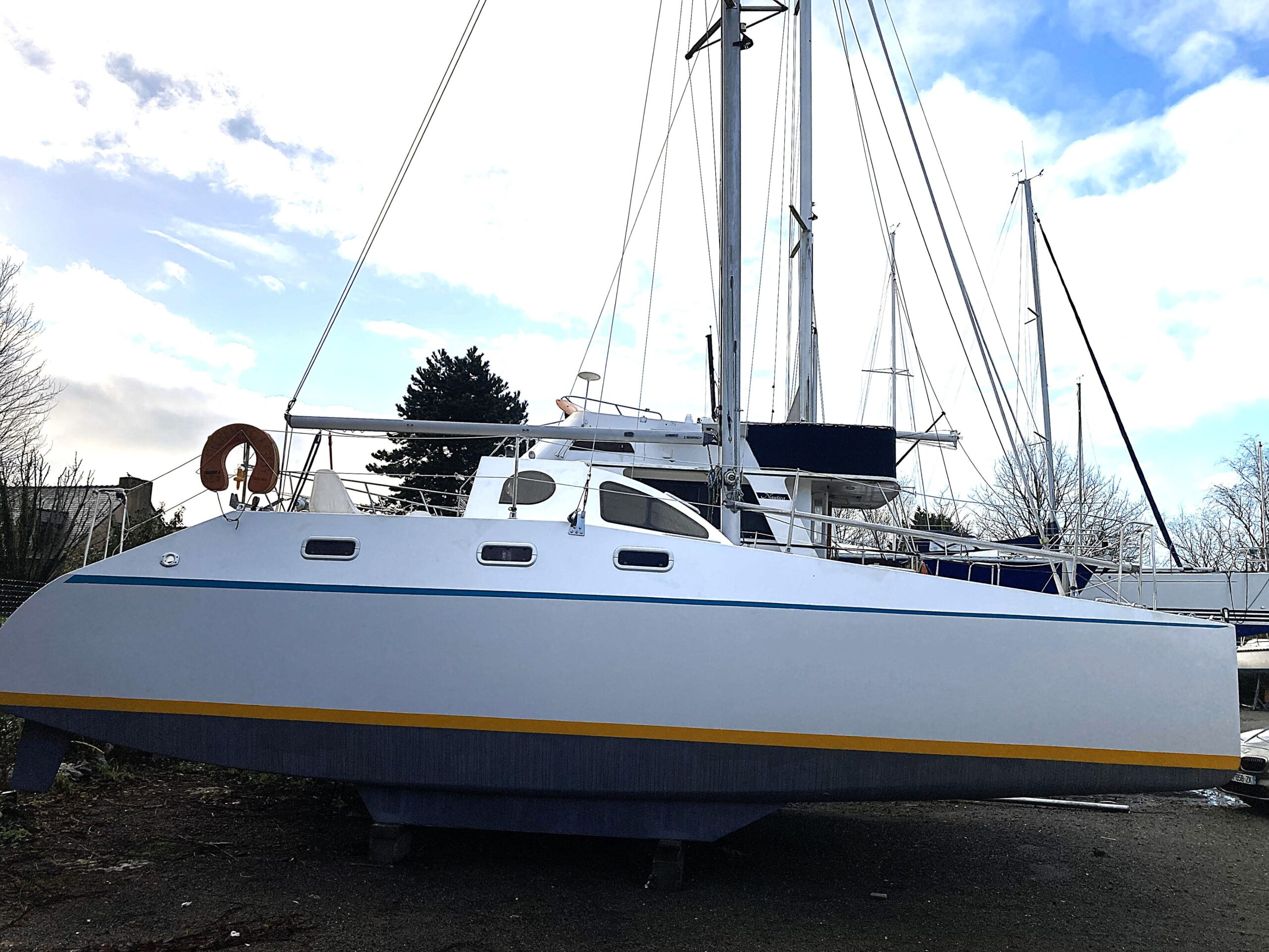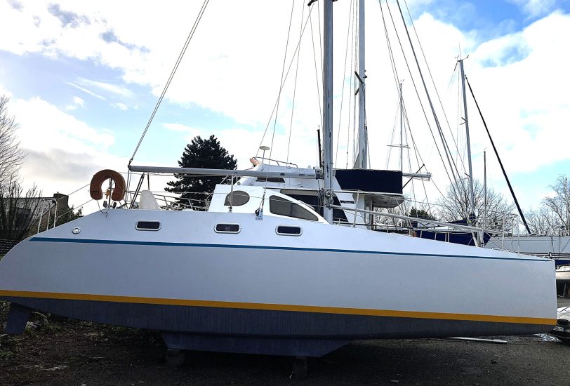 catamaran, capable de flâner aux Glénan, ou vous emmener de l'autre coté de l'atlantique ! Construction rigide en CP époxy du chantier Naval force 3; homologué insubmersible, en parfait état avec voiles neuves, moteurs récents . Son propriétaire, l'a toujours parfaitement suivi.